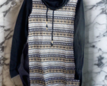 Features: Long sleeves, solid hood, sleeves and bottom, fair isle print otherwise. Cotton and polyester. Distressed sleeves near cuffs. Green, yellow and white.