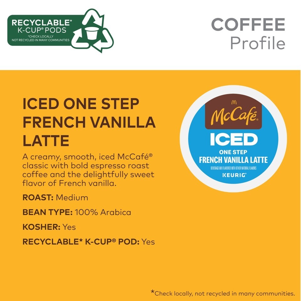 The McCafe Iced French Vanilla Latte One Step Coffee is a convenient and delicious coffee pod and capsule featuring a medium roast and a velvety vanilla flavor. With 60 K-Cups included, this kosher-certified latte is perfect for Keurig machines and offers 90 calories per serving. Made in the United States, this product contains milk allergens and is ideal for coffee lovers looking for a sweet and creamy beverage option to enjoy at home.