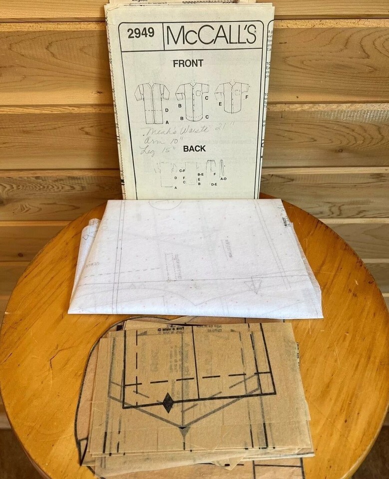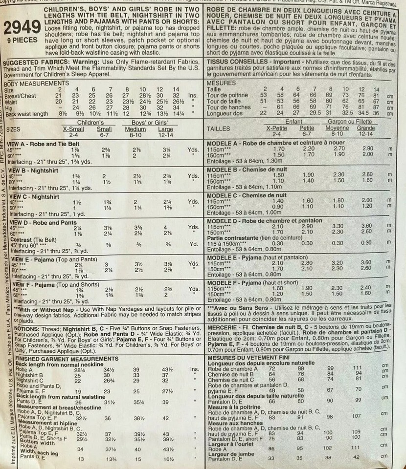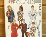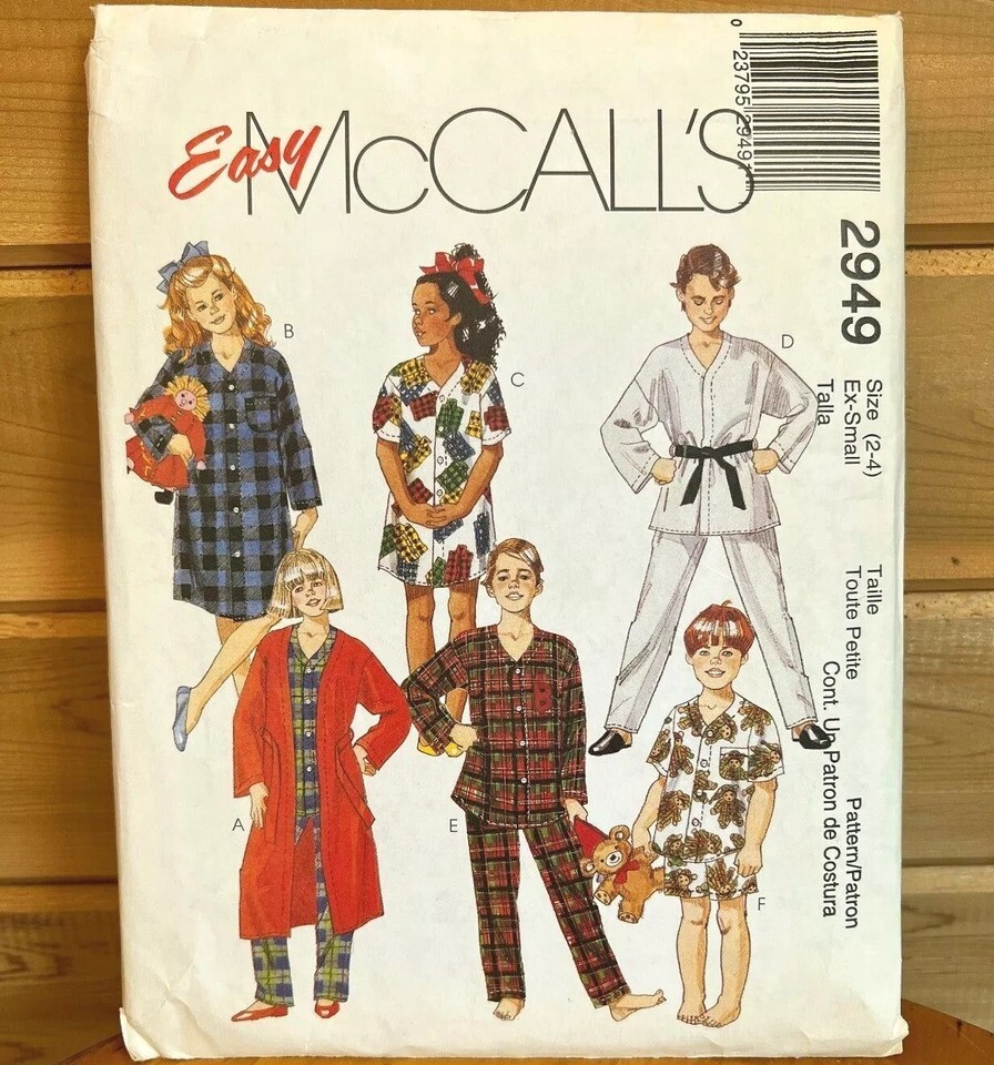 McCall's Vintage Home Sewing Crafts Kit #2949 2000 Easy Size XS 2-4 Boys/Girls robe in 2 lengths with tie belts, nightshirt in 2 lengths and pj's with pants or shorts Some wear, creasing and signs of age/storage. Item was opened but appears unused. As is. Many more like this available A8