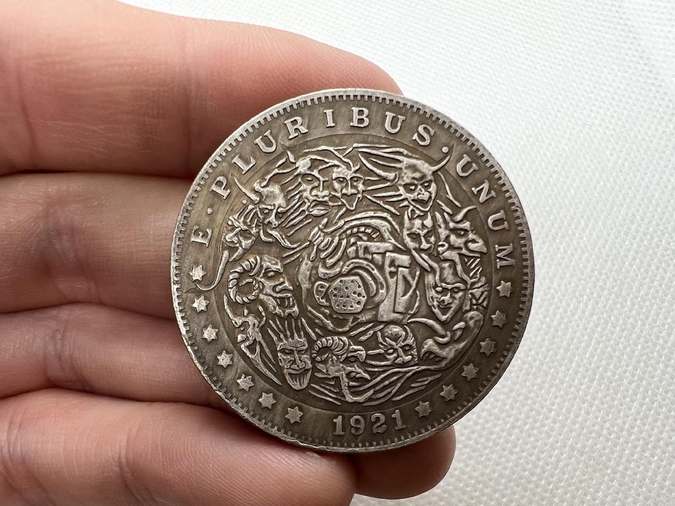 Scopri il fascino della replica della moneta fantasy a tema demoniaco del 1921, uno splendido pezzo che fonde l'arte numismatica tradizionale con un tocco fantasioso. Questa moneta unica presenta un design intricatamente dettagliato sul dritto, che mostra un'accattivante disposizione di teste demoniache e animali che forma un tableau surreale. L'iscrizione "E PLURIBUS UNUM", che si traduce in "Out of many, one", funge da struggente simbolo di unita tra le figure grottesche e stranamente incantevoli che incarnano un'estetica oscura.Sul retro, la replica presenta una rappresentazione piรน classica, con la maestosa aquila americana con le ali tese, che stringe un ramo d'ulivo e frecce, simboli senza tempo di pace e conflitto. Con le parole "UNITED STATES OF AMERICA" e la denominazione "ONE DOLLAR" blasonate, questo lato rafforza l'atmosfera autentica di una moneta storica americana.Realizzato come ristampa, questo straordinario pezzo trasforma una tradizionale moneta da un dollaro in un oggetto da collezione artistico che mostra dettagli squisiti e un design distintivo, attraendo appassionati d'arte e collezionisti che apprezzano le intersezioni tra fantasia e storia. Concediti l'accattivante storia dietro questa straordinaria moneta ed eleva la tua collezione con un pezzo che sicuramente incuriosira e ispirera.