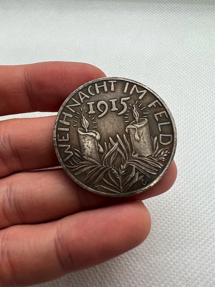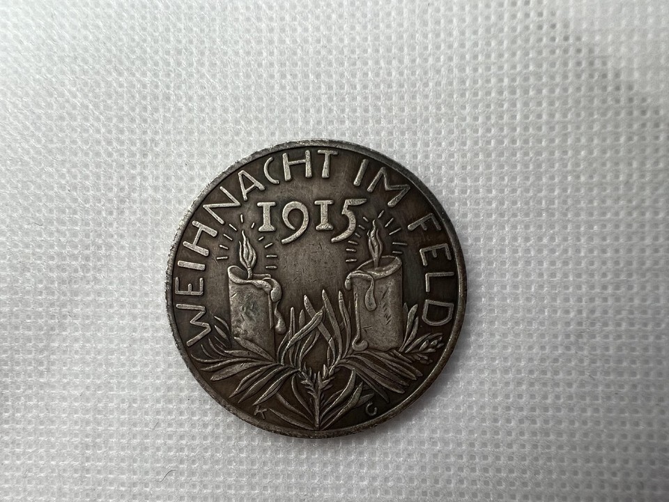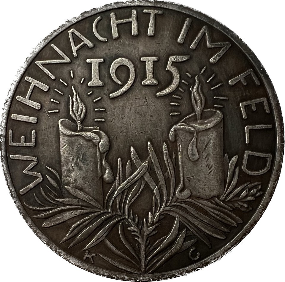 Sul retro, la medaglia presenta un simbolo struggente raffigurante "Weihnacht im Feld 1915", che si traduce in "Natale in campo 1915". Questa immagine, con due candele accese e fronde di palma, racchiude speranza e tranquillita nel caos della guerra. Accompagnato da una delicata iscrizione, riflette la connessione spirituale ed emotiva che i soldati hanno condiviso durante il Natale lontano dalle loro case.