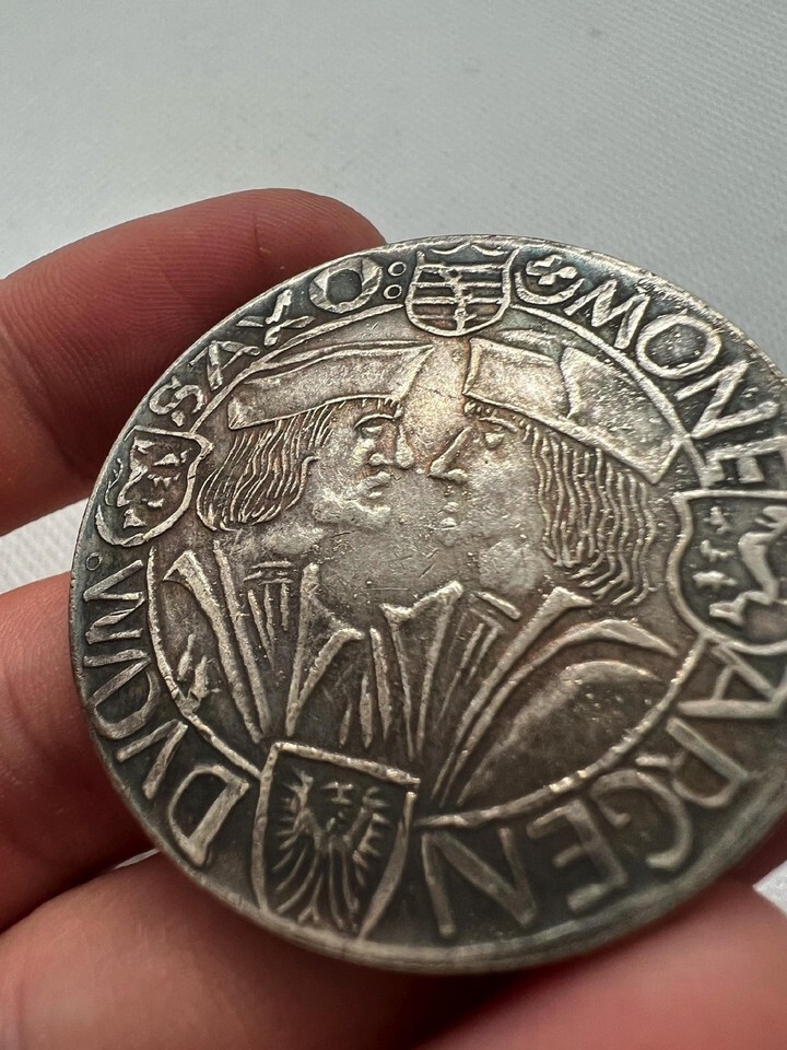Originariamente coniato nel XVI secolo, questo tipo di tallero era ampiamente accettato come valuta affidabile in tutta Europa durante quell'epoca. La replica cattura meticolosamente l'aspetto distintivo della moneta originale, completa di una patina che riecheggia la sua autenticita storica. Sul retro, due principi sassoni sono ritratti accanto ai simboli delle loro case nobiliari, illustrando il potere politico e il prestigio dell'Elettorato di Sassonia.