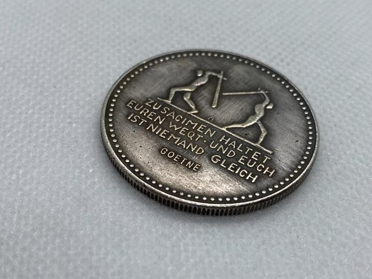 Este intrigante medallon de la era de la Primera Guerra Mundial sirve como una notable representacion artística que encarna el simbolismo de la alianza germano-austriaca. El anverso del medallon cuenta con dos majestuosas aguilas, emblematicas de Alemania y Austro-Hungría, cuyos destinos estaban estrechamente entrelazados durante los tumultuosos años de guerra. La imponente cabeza de aguila personifica la fuerza y ??la determinacion de estas naciones. En el reverso, una cita de Goethe esta elegantemente grabada, subrayando los temas de la unidad y el valor de la lucha colectiva. Este detalle artístico imparte significado historico y estetico, enriqueciendo el medallon con un mensaje mas profundo. Aunque es una reproduccion moderna, el diseño captura fielmente el espíritu de la epoca. Las imagenes de figuras empuñando espadas en el reverso reflejan el fuerte espíritu marcial de la epoca. El aspecto general y los detalles intrincados del medallon haran las delicias de los coleccionistas con interes en la Primera Guerra Mundial, ofreciendo una vision única de la historia y el arte de este período. Este medallon se erige como una adicion distintiva a cualquier coleccion, celebrando un momento crucial en la historia con gracia y perspicacia.