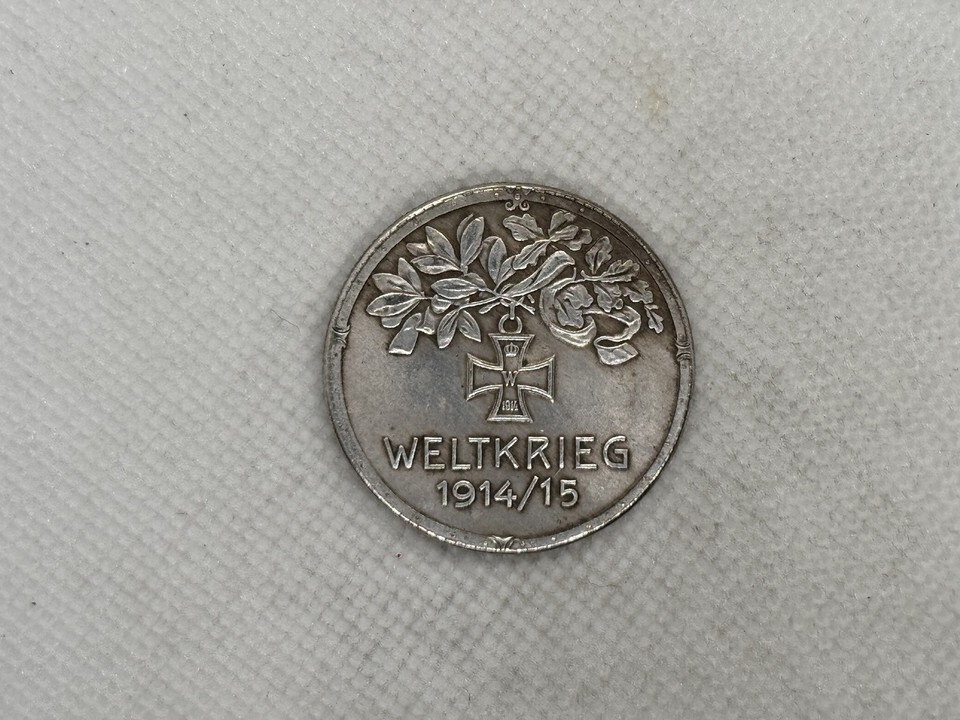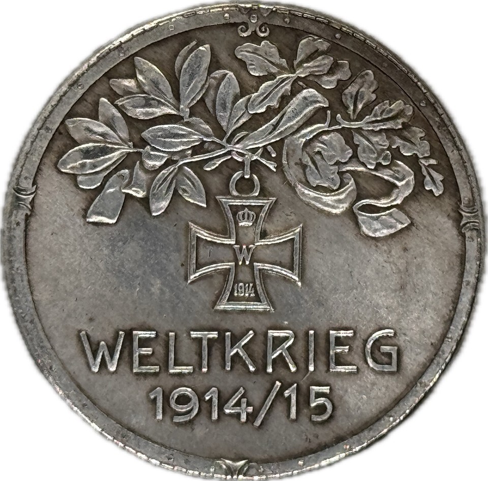 El reverso de la medalla esta decorado con una imagen de la Cruz de Hierro de 1914, una de las condecoraciones militares mas famosas del ejercito aleman, introducida por el emperador Guillermo II. La cruz se coloca bajo una rama de roble y laurel, símbolos de fuerza y victoria. La inscripcion "Weltkrieg 1914/15" (Guerra Mundial 1914/15) indica que esta medalla conmemorativa fue creada en honor a los eventos de la primera fase de la Gran Guerra. Gracias a su diseño artístico y contexto historico, es un objeto de coleccionista muy solicitado, ideal para los amantes de la historia militar y la numismatica.