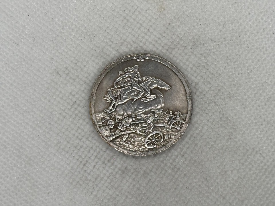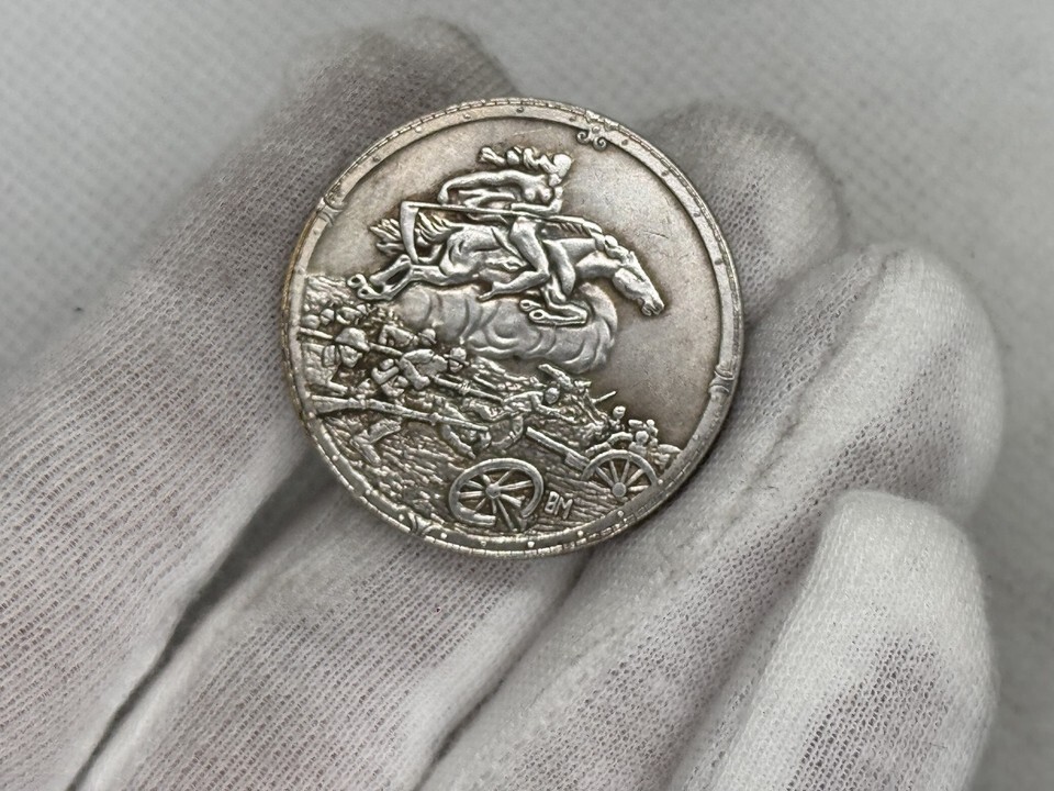 Esta medalla conmemorativa historica recuerda escenas dramaticas de la Primera Guerra Mundial (1914-1915) y cuenta con un relieve excepcionalmente elaborado. El anverso representa a un jinete cruzando el campo de batalla, mientras que los soldados y el equipo de artillería se pueden ver en movimiento en el fondo. Esta escena dinamica evoca el rapido movimiento de unidades militares en condiciones de combate difíciles. Detalles como los cañones renderizados de manera realista, los soldados en trincheras y un caballo al galope completo atestiguan el valor artístico e historico de la medalla. La marca "BM" en la parte inferior probablemente se refiere al autor o fabricante de esta acuñacion.