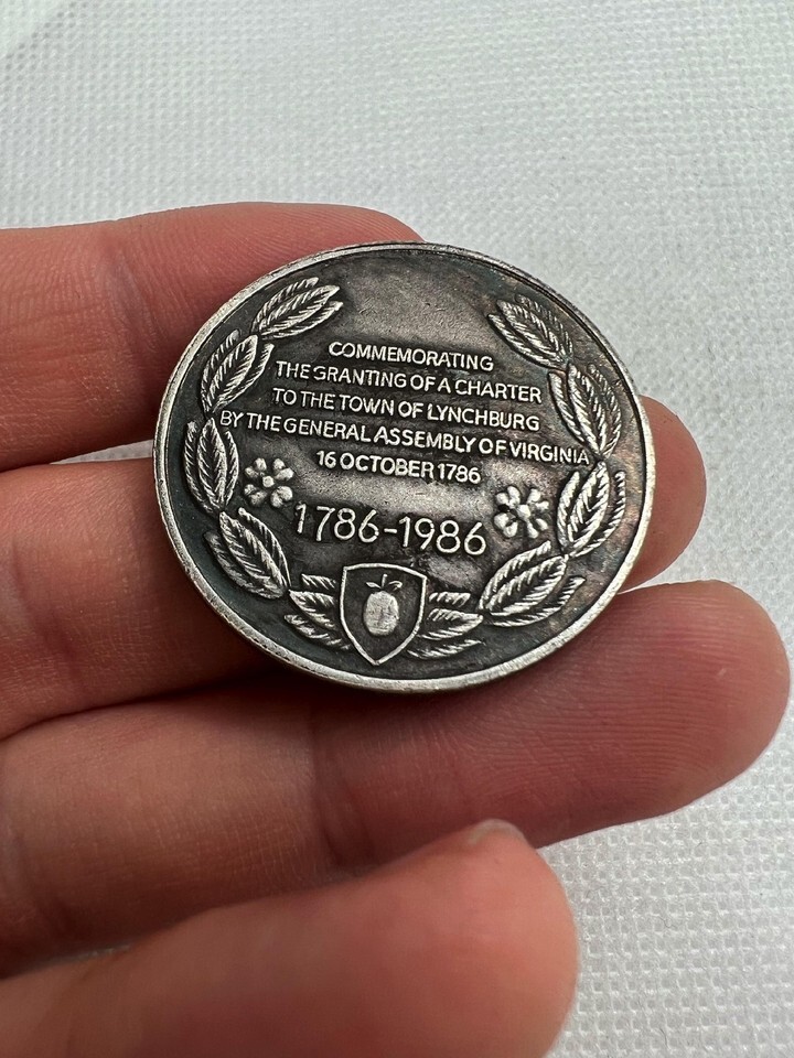 Acompañada por los años "1786-1986", esta pieza simboliza la importancia duradera de este evento para los residentes de Lynchburg. Muy apreciada entre los coleccionistas, la Medalla de Fantasía Conmemorativa del 200 Aniversario de Lynchburg es una sorprendente representacion de la historia y el arte, por lo que es una adicion significativa a cualquier coleccion.
