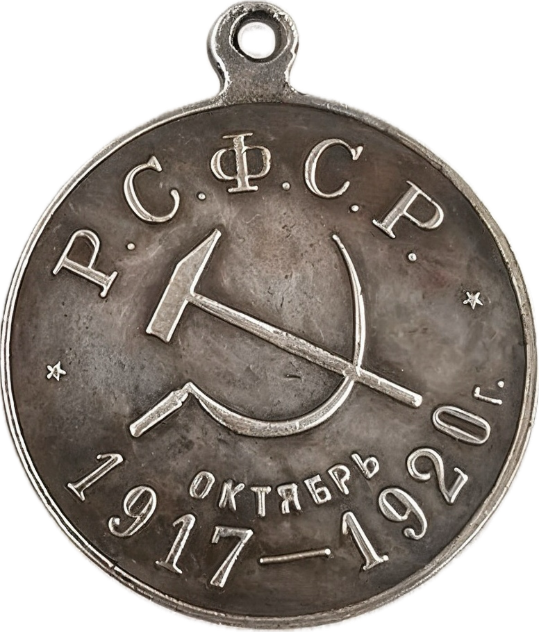 Esta medalla conmemorativa es un artefacto significativo que rinde homenaje al período revolucionario de octubre de 1917 a 1920. Encapsula brillantemente el espíritu de una era transformadora, con un diseño llamativo que subraya temas de trabajo y unidad. El anverso muestra una poderosa figura que simboliza a la clase trabajadora, armada con un rifle y un martillo, con el telon de fondo de una estrella y ununque, que representa efectivamente los ideales de fuerza y defensa. La inscripcion en negrita, "?????????? ???? ?????, ????????????!" ("Proletarios de todos los países, ¡uníos!"), refleja ademas el espíritu de solidaridad entre la clase obrera mundial.