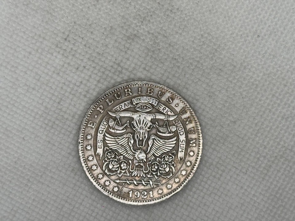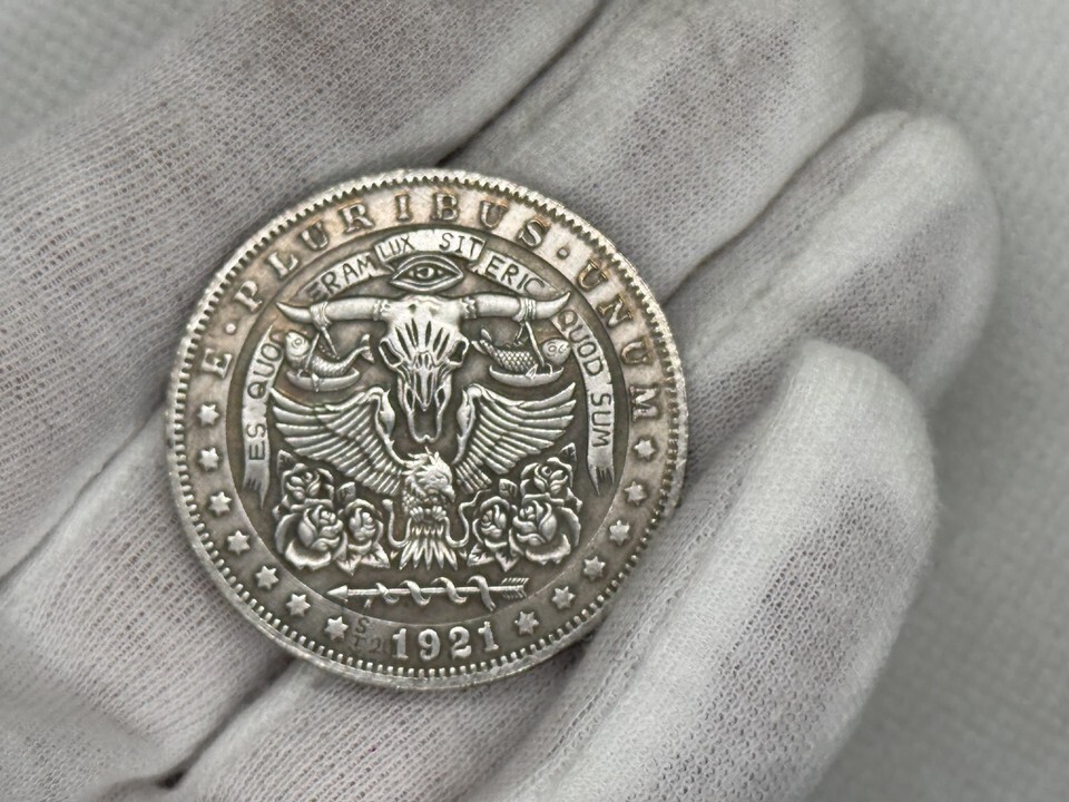 Esta medalla grabada única, inspirada en el iconico dolar Morgan de 1921, es una impresionante pieza de arte rica en simbolismo. El anverso presenta una majestuosa calavera de toro adornada con el Ojo de la Providencia, rodeada de inscripciones latinas y adornos místicos, que evoca una profunda conexion con las sociedades secretas y las enseñanzas esotericas. Las alas de un aguila, junto con motivos de una rosa y una serpiente, añaden un significado mas profundo, entrelazando temas de mortalidad, sabiduría y el poder de la naturaleza.