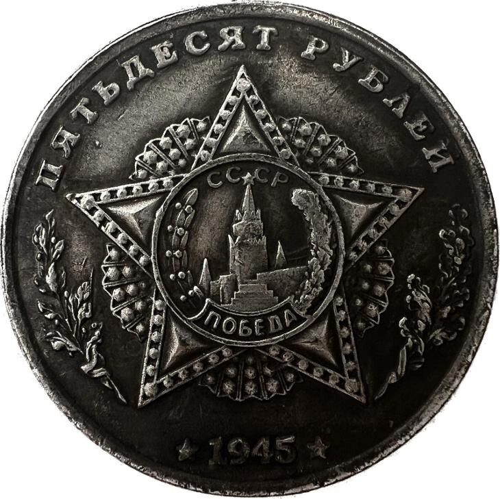 El reverso de la moneda presenta el motivo clasico de la estrella de la victoria junto al Kremlin, que simboliza el triunfo del Ejercito Rojo durante la Segunda Guerra Mundial. Estas imagenes son un poderoso recordatorio de la victoria lograda a un gran costo por la Union Sovietica. El año 1945 se muestra de manera prominente, marcando el final de la guerra y el resultado exitoso de las fuerzas aliadas contra la Alemania nazi.