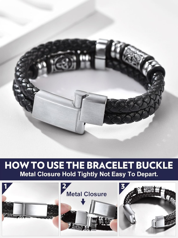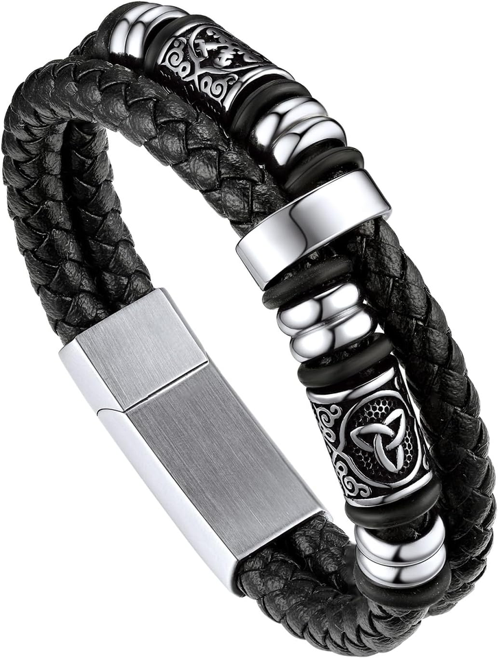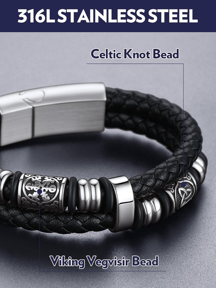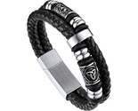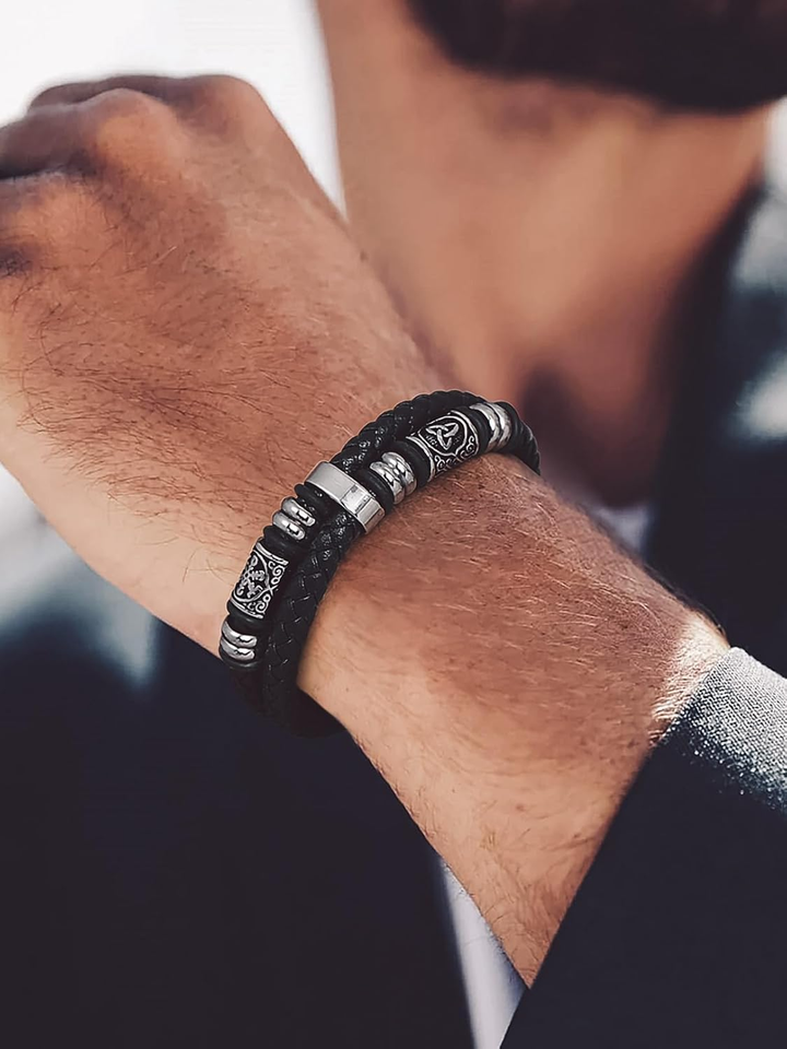 - Men's Double Layer Black Braided Leather Wristband with Steel Beads