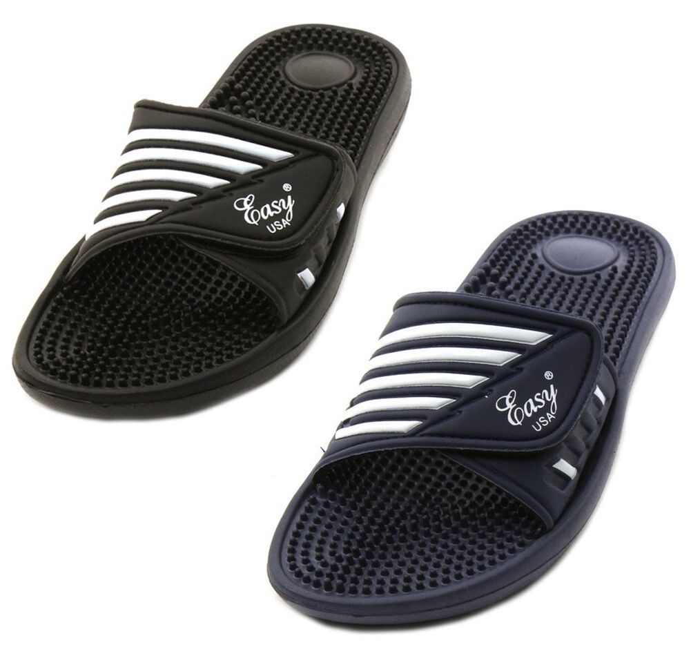 Men's Massage Sandals Flip Flops Adjust Strap Slide Sport Slip on Slippers Sizes: 7-12 Synthetic upper, Acupressure Massage Foot Bed, Non-skid outsole, Adjustable Adjust straps Lightweight and comfortable, Good for the sport, water, summer, pool, etc. Description: Condition: New without Box Style: Flip-Flops, Sandals Material: Synthetic Upper, EVA outsole Color: Black, Navy Width: Medium (D,M) Size: 7, 8, 9, 10, 11, 12 Package Included: 1 Pairs of Sandals without Box