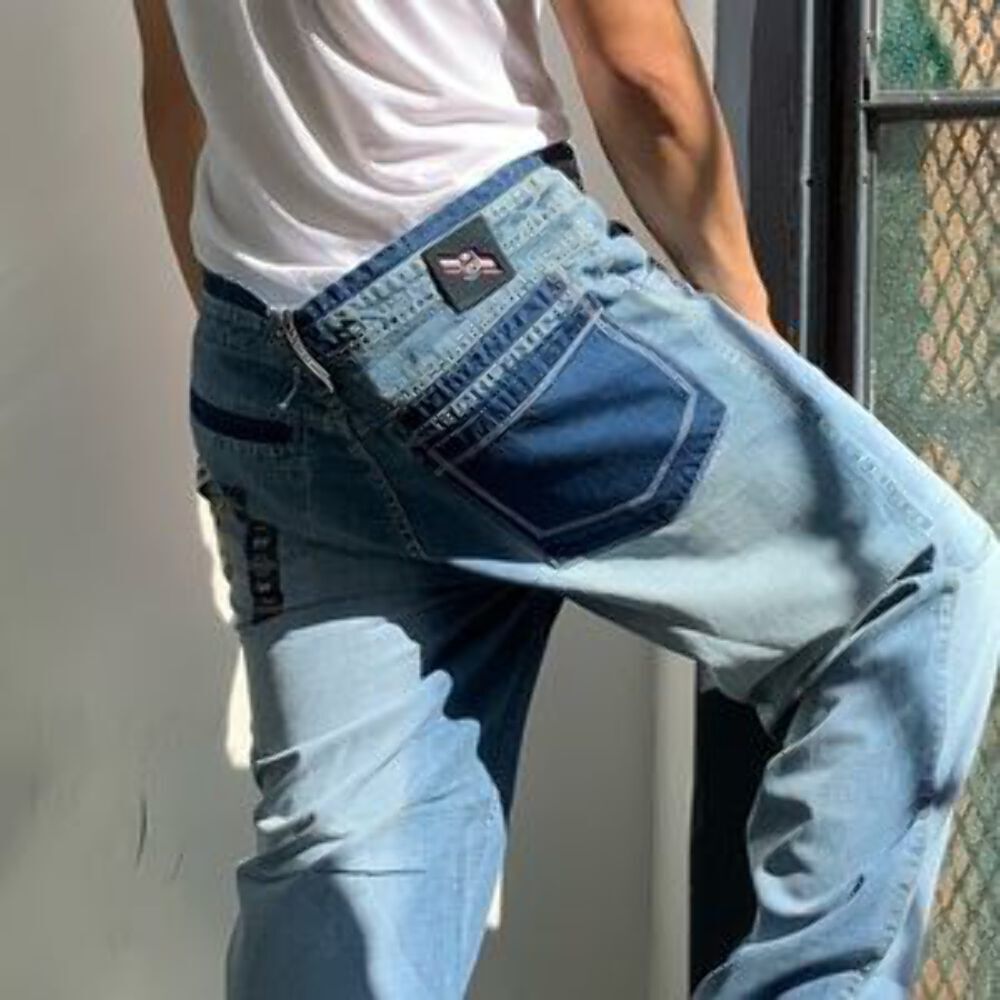 - Men's Phat Farm Mid Blue Sandblast Wide Leg Denim Pants NWT