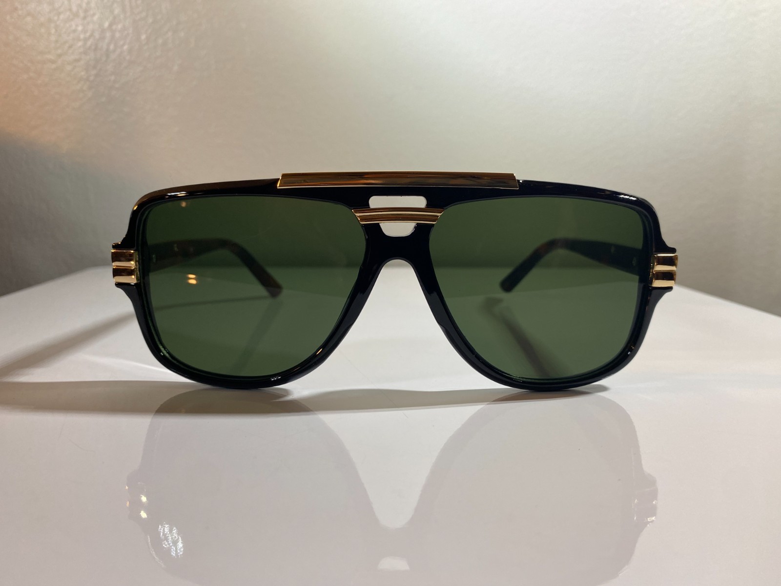 Men's Run-DMC style sunglasses with green lenses & black frame with gold accents