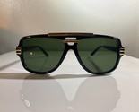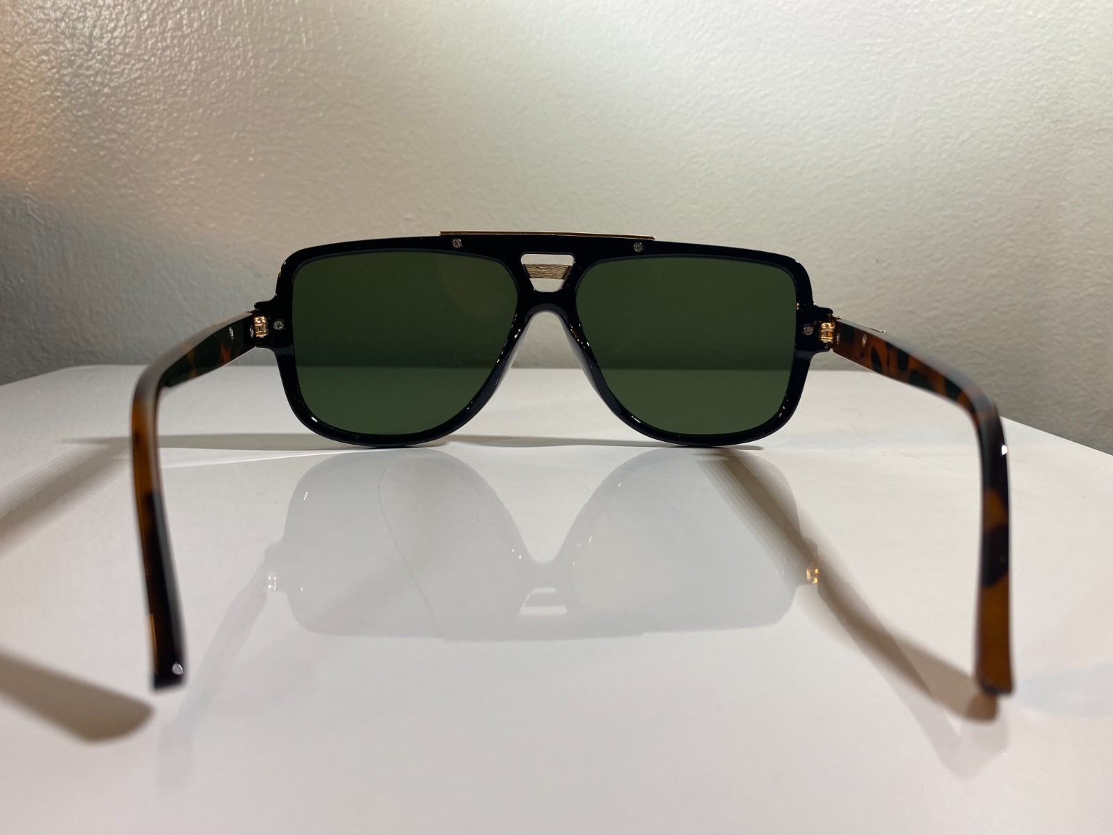- Men's Run-DMC style sunglasses with green lenses & black frame with gold accents