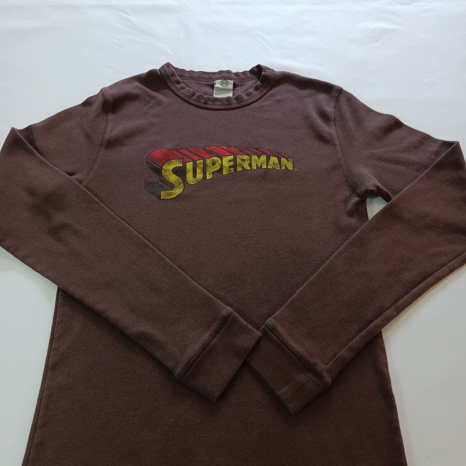 Show off your love for Superman with this DC Comics brown shirt. Made with a blend of polyester and cotton, this thermal shirt features a solid pattern with a crew neck and long sleeves. The slim fit shirt is perfect for any Superman fan and is available in size S. The shirt is designed with the iconic Superman logo and is a great addition to any wardrobe. Perfect for casual wear, this shirt is sure to make a statement. Please check pictures for accurate measurements. All used clothing is pre-washed and stored in a smoke-free home. Please contact us for any issues or concerns. Thank you. 1114