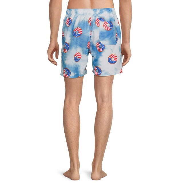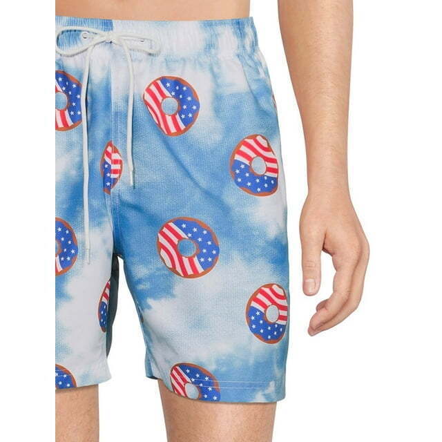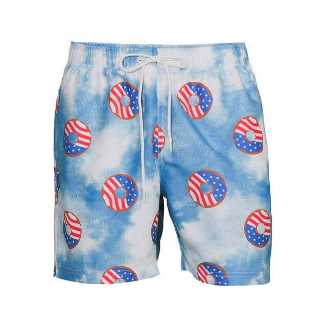 Men's US of Donuts Swim Trunks, Size 3XL (48/50) Sweet! It?s all about the red, white and blue in fun prints featured on these US of Donuts Swim Shorts from Way to Celebrate. With a pull-on style, elasticized waist and drawstring tie for an adjustable, comfortable fit, these swim shorts feature multiple pockets to hold essentials and a mesh liner for support. Slip on these swim shorts for Fourth of July festivities, backyard barbecues or the next pool party?you?re ready to make a splash. Material: 100% Polyester Care: Machine washable Country of Origin: Imported Fit: Relaxed Rise: Mid-rise Closure: Pull-on style; elasticized waist for added comfort Pockets: 2 side pockets; 1 back pocket holds essentials Features: Drawstring tie; contrast prints; mesh liner Men?s US of Donuts Swim Shorts from Way to Celebrate