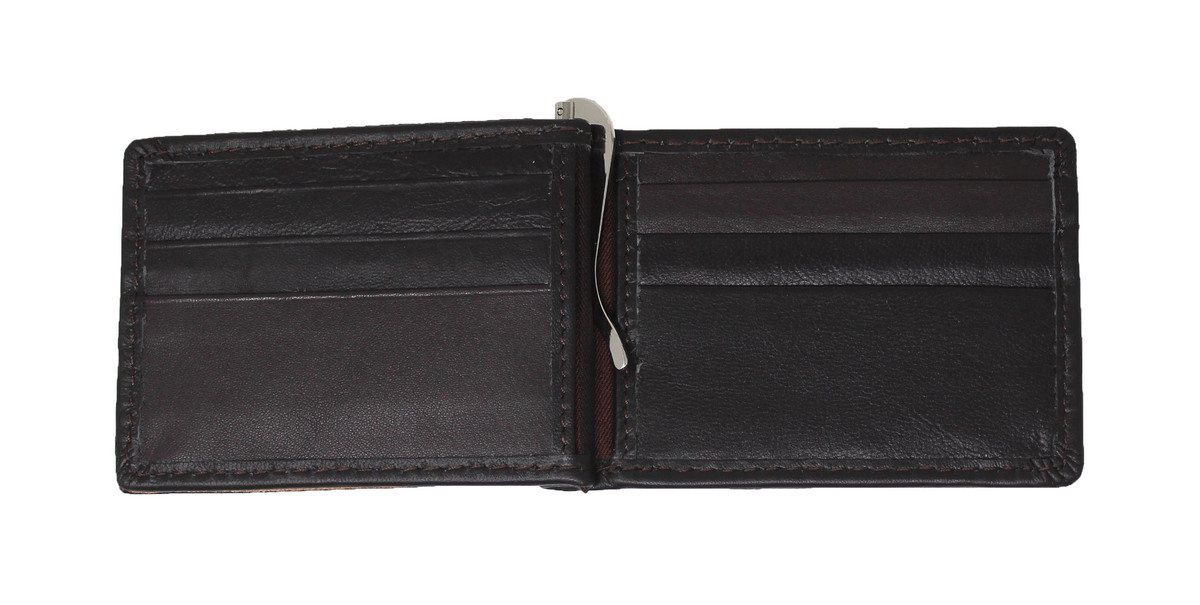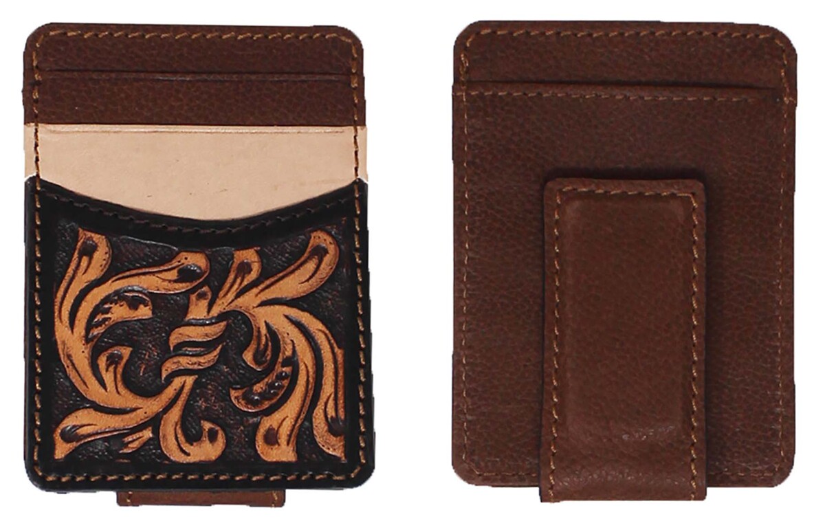 Challenger men's western minimalist money clip wallet hand-made from supple genuine full-grain leather. Wallet comes accented with a hand-tooled antique floral design. Wallet measures 3" L x 4" H, and features six credit card slots.