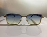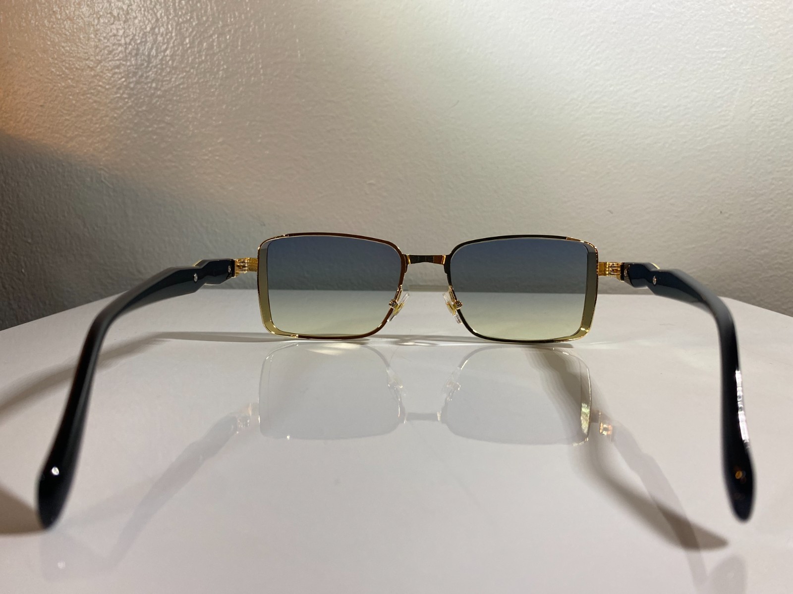 - Men's futuristic style sunglasses with blue gradient lenses and gold wire frame.