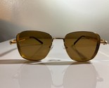 - Men's futuristic style sunglasses with brown lenses and gold wire frame.