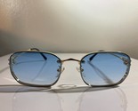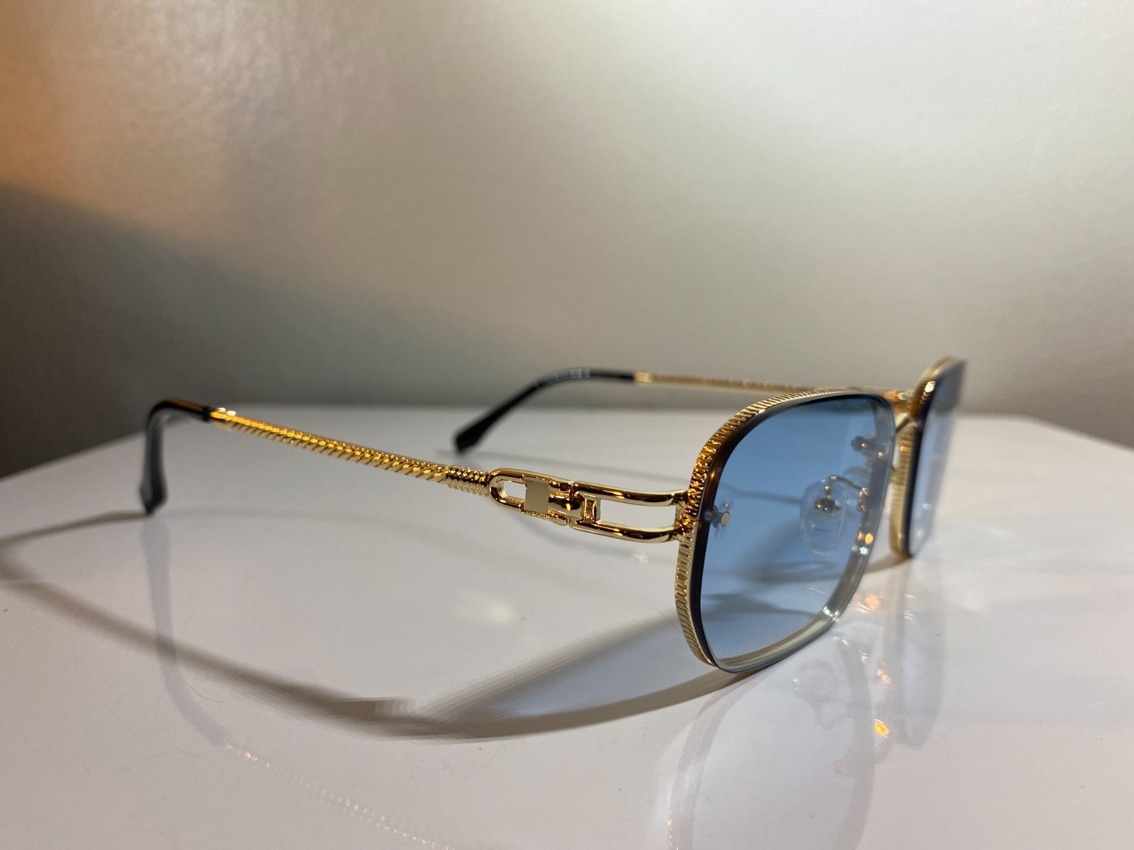 - Men's, rounded, rectangular sunglasses with blue lenses & gold wire frame.