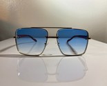- Men's sunglasses with blue gradient lenses and gold wire & wood pattern frame.