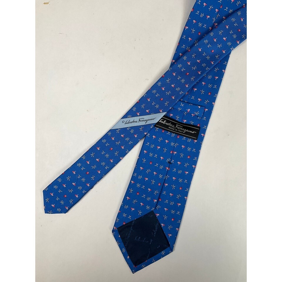 Men?s Salvatore Ferragamo silk tie featuring a blue dragonfly pattern. Excellent overall condition with a small stain that may come out with professional dry cleaning. Measures 58 inches in length and 3 1/2 inches in width. Made in Italy from 100% silk. No box included.