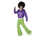 Super Funky Retro Costume. Late 60's or 70's. Shirt is a satiny material and looks like it would wrinkle easily. Economical Costume. Could be used for a Hippie, Mack Daddy, Pimp. Gangsta, Solid Gold Disco King, Funky Fella, etc. DOES NOT INCLUDE WIG, GLASSES, JEWELRY, OR SHOES.