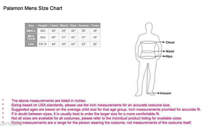 NOTE: Listing is for items listed as included only. Some accessories may be pictured but are not included. All are new in package. Costumes will have wrinkles / creases from being in package, please see care instructions before trying to iron, etc. A quick and easy way to help eliminate wrinkles is by using a spray bottle form of fabric wrinkle releaser (not included). New in package items may have long / loose threads or strings that may require trimming, these are not considered defects. For Costumes, please refer to chart in this listing as reference for estimating size, always choose a size larger if borderline. Individual results will vary. Please note everyone's body is made different and costumes may not fit as they fit the models in the photos. If you are unsure of the size you need or if your in between sizes, please choose the larger size. These are costumes and should fit comfortably. All sizing information is provided by manufacturer. NO RETURNS OR EXCHANGES ON COSTUMES. Some Features, Packaging, Colors and Texture may vary slightly. Manufacturer may change some Features, Packaging, Colors and Textures so actual costume may vary slightly from picture. Any known differences will be stated in description. Manufacturer's Photo. Sold as is New in Package. This item may ship in an envelope: folding and or removal of plastic hanger may be necessary.