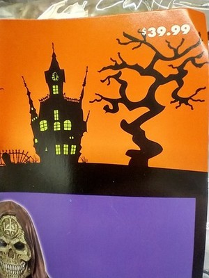 Adult Ancient Reaper costume. The robe is printed fabric has jagged cut edges. The mask has a skull look with ancient symbols all over it. Does not include gloves or shoes. Could be worn with or without the mask. Also could be a Unisex costume.