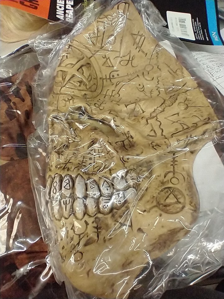 Adult Ancient Reaper costume. The robe is printed fabric has jagged cut edges. The mask has a skull look with ancient symbols all over it. Does not include gloves or shoes. Could be worn with or without the mask. Also could be a Unisex costume.