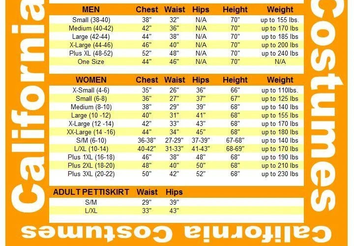 NOTE: Listing is for items listed as included only. Some accessories may be pictured but are not included. All are new in package. Costumes may have some wrinkles or creases from being folded or in package, please see care instructions before trying to iron, etc. A quick and easy way to help eliminate wrinkles is by using a spray bottle form of fabric wrinkle releaser (not included). New in package items may have long / loose threads or strings that may require trimming, these are not considered defects. For Costumes, please refer to chart in this listing as reference for estimating size, always choose a size larger if borderline. Individual results will vary. Please note everyone's body is made different and costumes may not fit as they fit the models in the photos. If you are unsure of the size you need or if your in between sizes, please choose the larger size. These are costumes and should fit comfortably. All sizing information is provided by manufacturer in U.S. sizes. International buyers please know size conversions for your country. International buyers purchase sized items at their own risk. Some Features, Packaging, Colors and Texture may vary slightly. Manufacturer may change some Features, Packaging, Colors and Textures so actual costume may vary slightly from picture. Any known differences will be stated in description. Stock Photo. No Returns or Exchanges on Costumes. As is New in Package. Exact colors cannot be guaranteed. Monitors and screens display colors differently, please keep this in mind. I have no way of knowing what you are seeing.