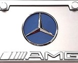 Mercedes Benz AMG 3D Emblems on a brushed aluminum license plate + shiny stainless steel frame, protective lens mounting hardware.