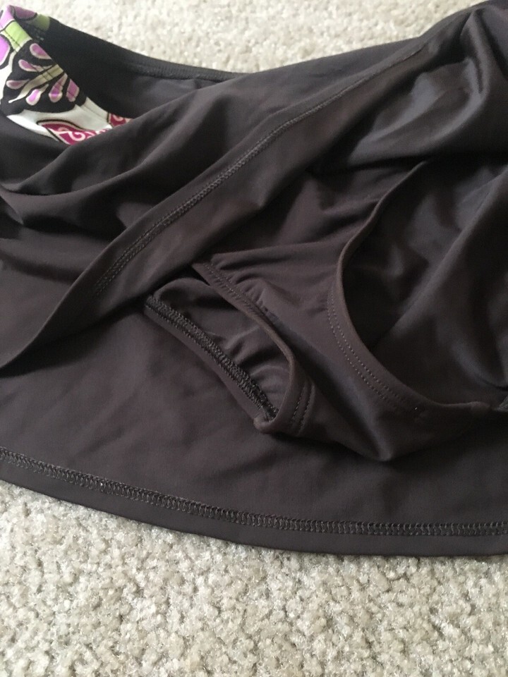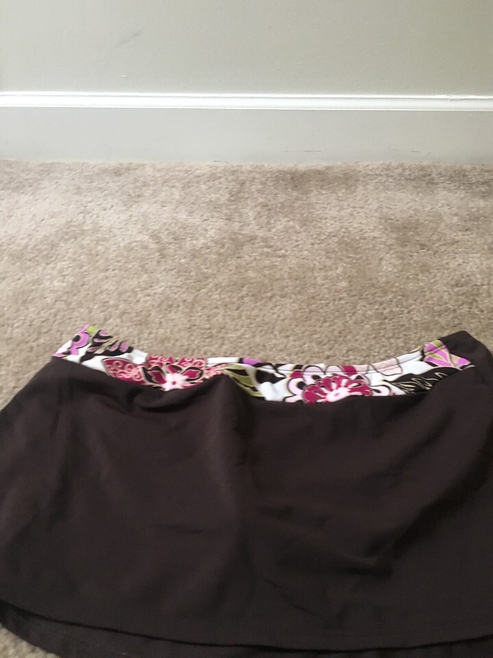 Merona Women's Swim Skirt with Attached Brief Black with Floral Print Trim Size M in good condition. There are lightish looking spots/stains in the panty liner area itself.