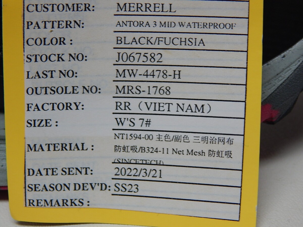 Merrell Antora 3 Mid Waterproof Size US 7 EU 37.5 Women's Hiking Shoes J067582 SAMPLE Size US 7 M, EU 37.5, UK 4.5 THIS SHOE'S CONDITION: NEW WITHOUT BOX. -Notes: IF THE ITEM IS NOT TO YOUR EXPECTATION WE OFFER A 30 DAY RETURN POLICY. ABOUT US: We specialize in footwear shoe accessories at a highly discounted price. We have a selection of new shoes, and also some displays, demos, pre-owned as well. PHOTOS: New Shoes: We usually send the the exact shoes pictured but may occasionally use our own stock images to represent several shoes. Store Displays, Demos, Pre-owned Shoes: We will send the EXACT shoes pictured here. A NOTE ABOUT OUR PRE-OWNED SHOES: We try to catch everything and describe it in the listing, but there are some things we may miss on occasion. This is why we take several pics of all pre-owned shoes from every angle possible so you as the buyer see what you will be getting. Also, because we are re-sellers we do not know the exact mileage of the shoes. SHIPPING: Shoes are in stock and ready to ship. We have a 1 day handling time but will usually ship same day if you purchase before 3PM Central Standard Time Need the item faster? We offer priority, expedited, and express one- day shipping on nearly all of our items We will combine shipping for expedited and one day deliveries. International Buyers Please Note: Import duties, taxes, and charges are not included in the item price or shipping cost. These charges are the buyer's responsibility. Please check with your country's customs office to determine what these additional costs will be prior to bidding or buying. QUESTIONS? Message us- we are usually very fast at responding!