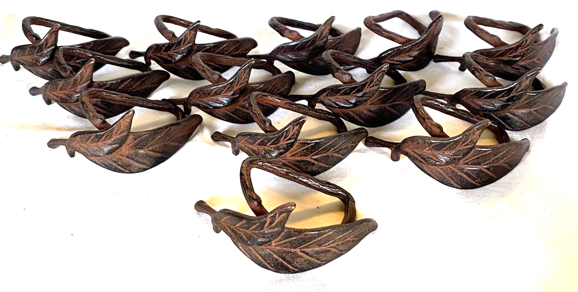 Leaf Metal Napkin Rings Lot of 13 Brown with Rust Veins 2 Intertwined Leaves with Stem Very Good Condition. See all photos. Non-smoking home. Be sure to check out my other items! I am happy to combine shipping charges. Please note: My goal is always 100% complete customer satisfaction. If for any reason you feel your item arrives "not as described," please contact me before leaving feedback. I am a trading assistant. I can sell items for you! |KES-PLA|