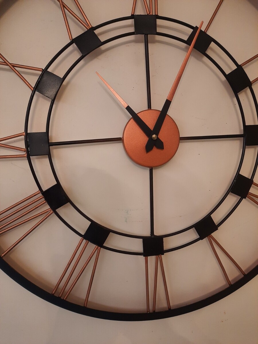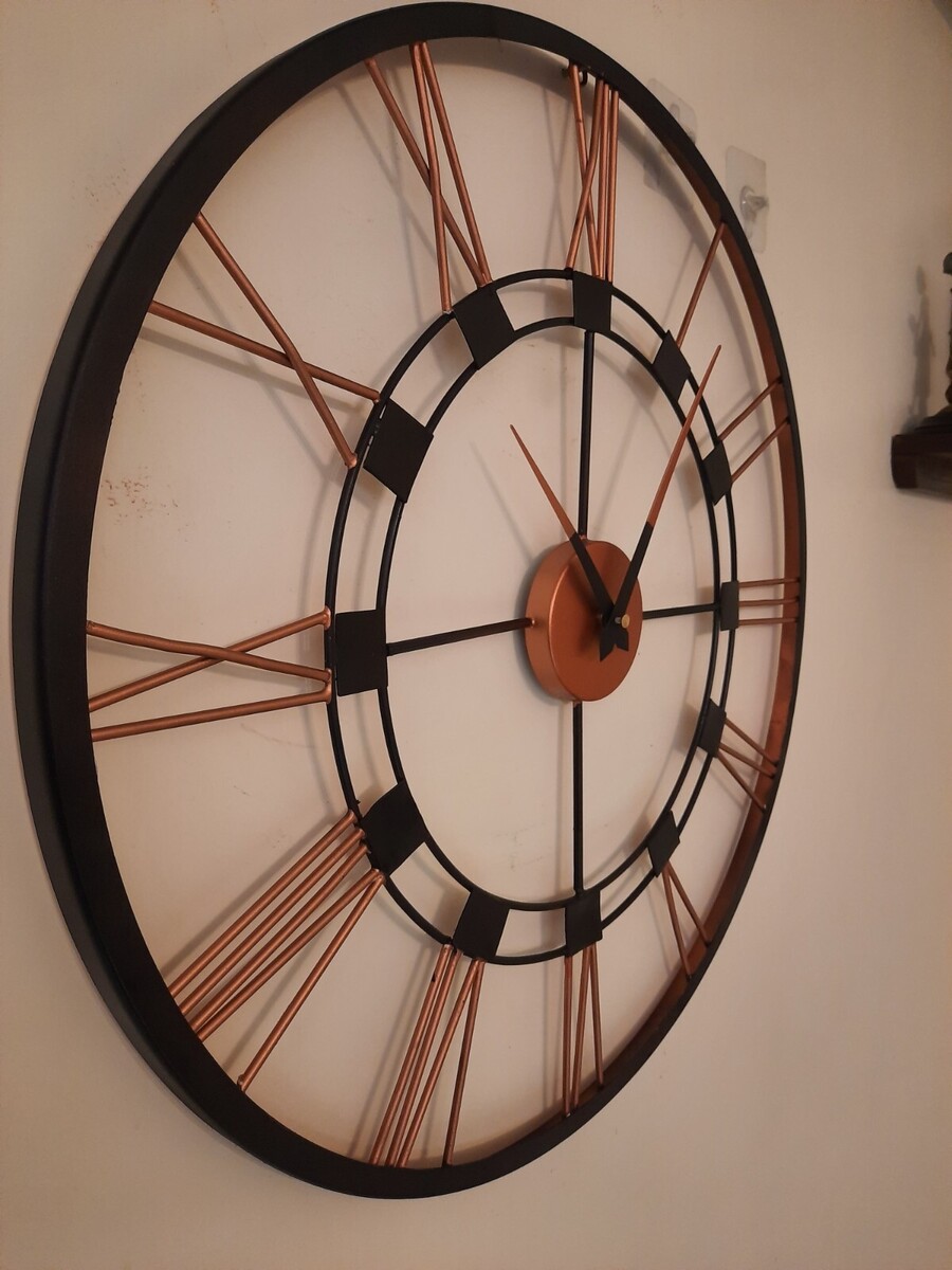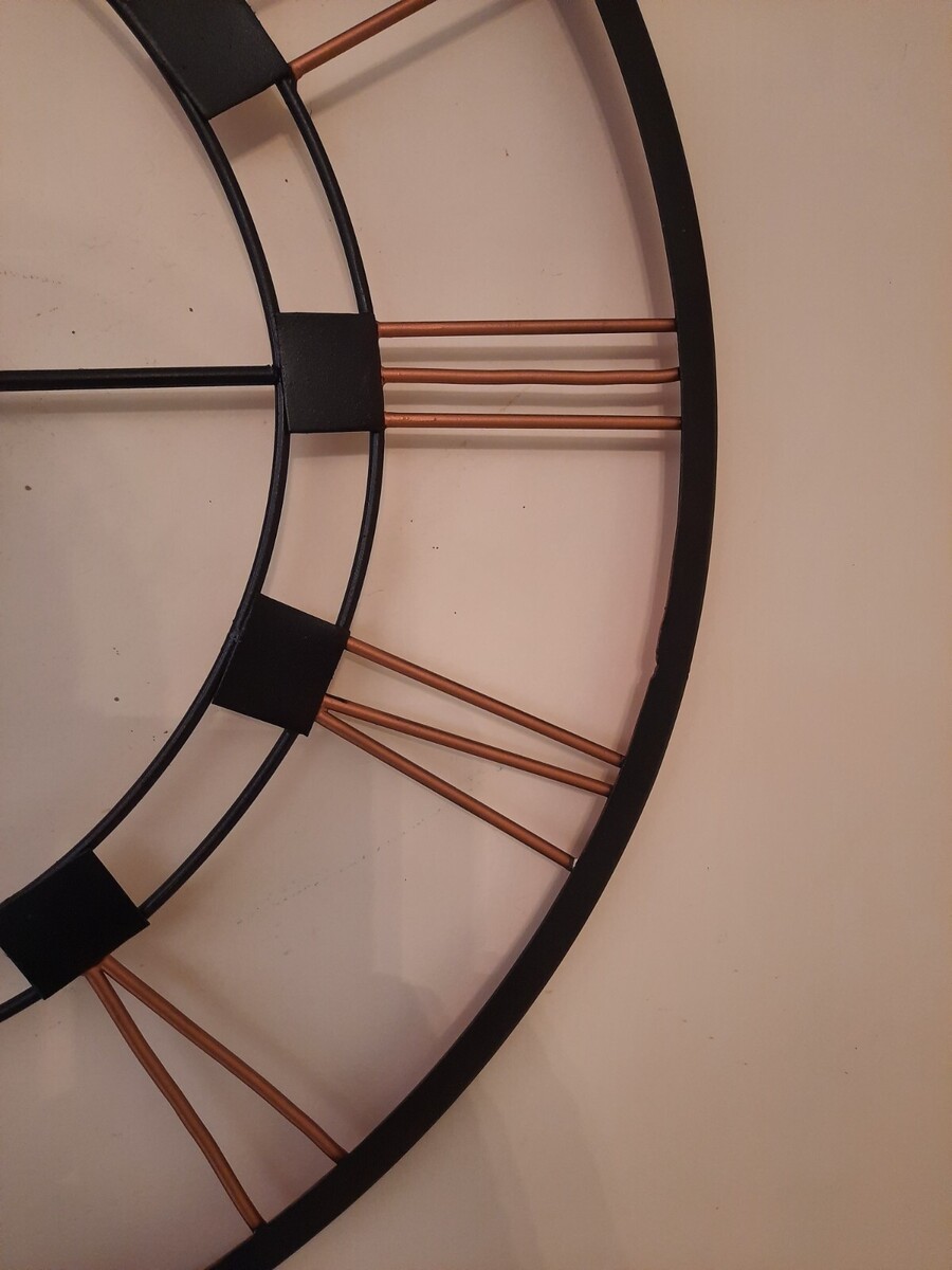 Handgefertigtes Metallskelett in Tiefschwarz und Kupfer (halb und halb), mattes Finish, Heimdekoration, Wandkunst, romischer Vintage-Stil, antik, die Zeiger sind ebenfalls in Schwarz und Kupfer gehalten. Die runde, große Industrieuhr ist ein Design aus dem 18. Jahrhundert, aber immer noch ein sehr IN-Design. Eines unserer meistverkauften Designs aus massivem Metall, das ihm einen antiken, modernen und Vintage-Look verleiht. Diese opulente Uhr passt aufgrund ihrer Transparenz zu jeder farbigen Wand. Die Große betragt 22 Zoll x 22 Zoll und das Gewicht betragt 1 kg. Auf der Rückseite befindet sich ein Haken zum Aufhangen an der Wand. Ein gutes Hochzeitsgeschenk, Brautjungferngeschenk, Trauzeugengeschenk, Geschenk für die beste Freundin. Diese Uhr ist in Luftpolsterfolie und einem Wellp