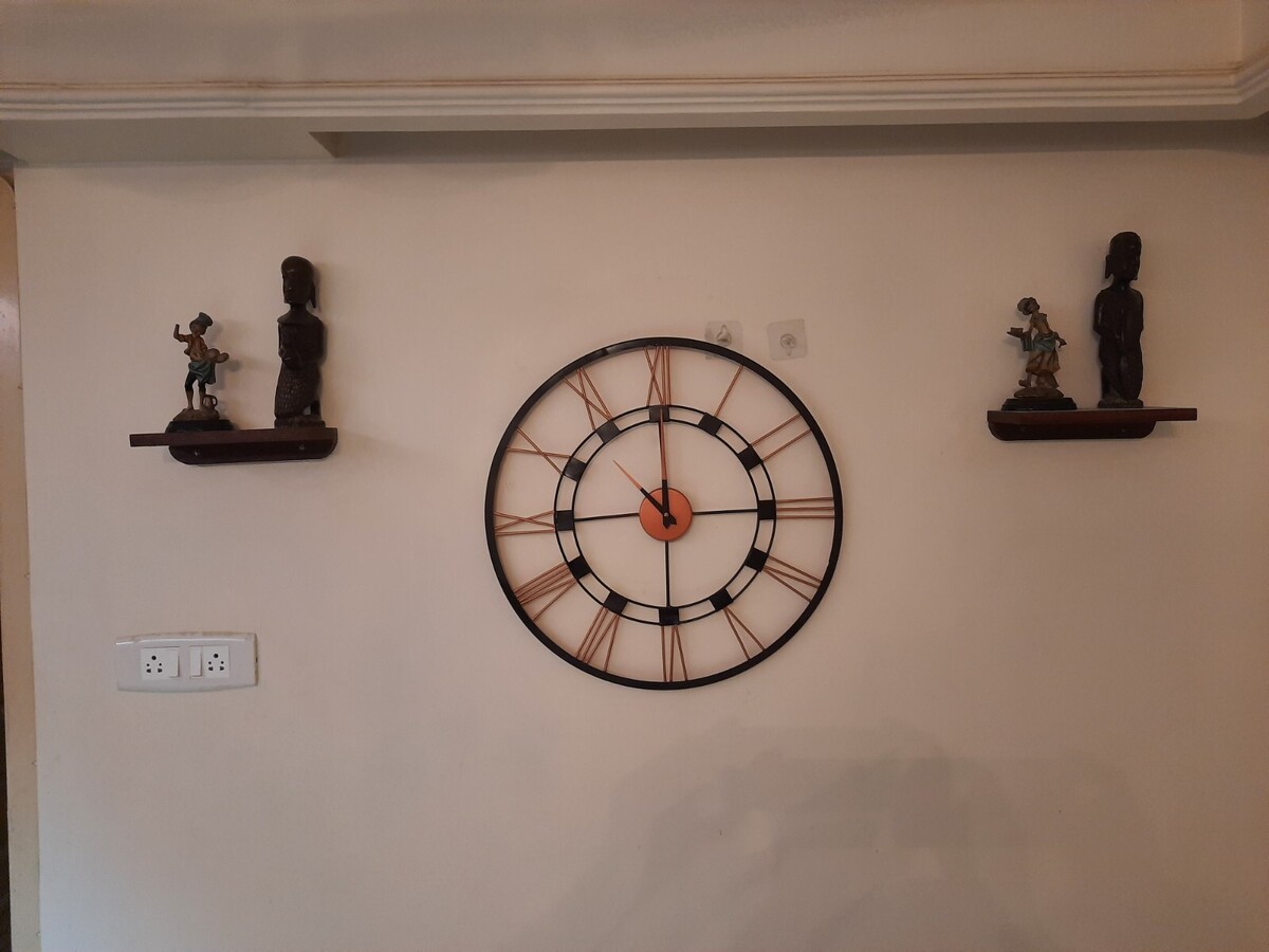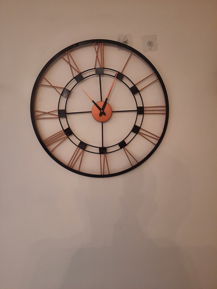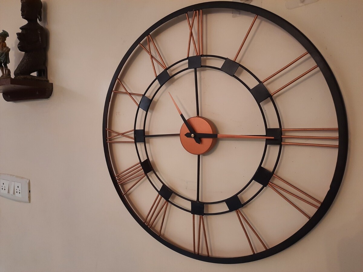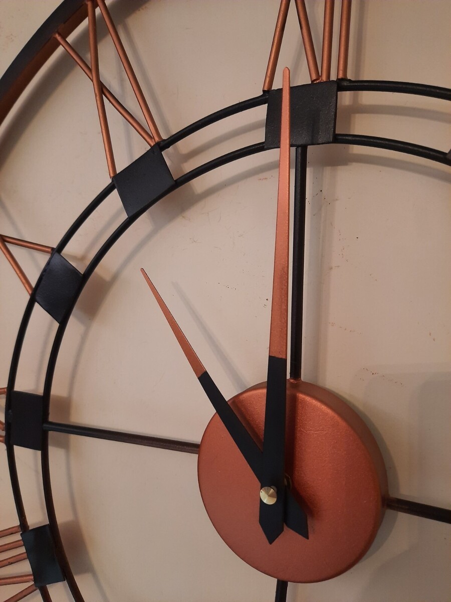 Handgefertigtes Metallskelett in Tiefschwarz und Kupfer (halb und halb), mattes Finish, Heimdekoration, Wandkunst, romischer Vintage-Stil, antik, die Zeiger sind ebenfalls in Schwarz und Kupfer gehalten. Die runde, große Industrieuhr ist ein Design aus dem 18. Jahrhundert, aber immer noch ein sehr IN-Design. Eines unserer meistverkauften Designs aus massivem Metall, das ihm einen antiken, modernen und Vintage-Look verleiht. Diese opulente Uhr passt aufgrund ihrer Transparenz zu jeder farbigen Wand. Die Große betragt 22 Zoll x 22 Zoll und das Gewicht betragt 1 kg. Auf der Rückseite befindet sich ein Haken zum Aufhangen an der Wand. Ein gutes Hochzeitsgeschenk, Brautjungferngeschenk, Trauzeugengeschenk, Geschenk für die beste Freundin. Diese Uhr ist in Luftpolsterfolie und einem Wellp