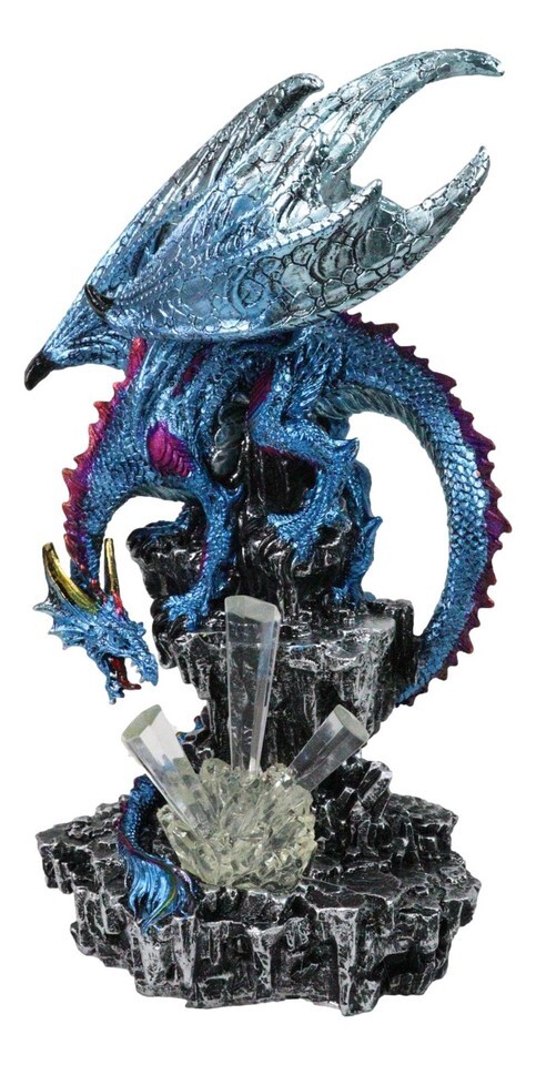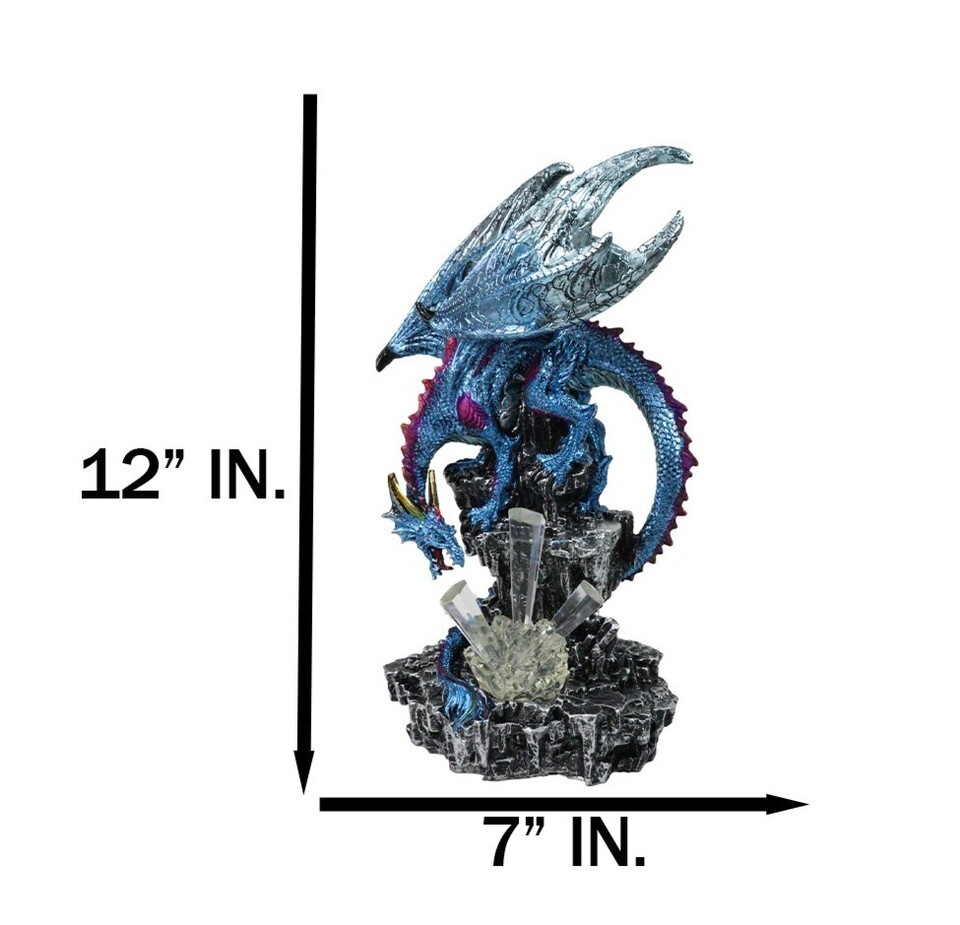 ? Illuminate your space with the Blue Dragon Guarding Crystals Figurine. This captivating piece features a fierce dragon in shimmering blue hues with vivid magenta spikes, protectively encircling glowing ice-like crystal formations powered by LED light. Radiant and dramatic, it brings a touch of fantasy and power to any room. Perfect for dragon collectors, fantasy decor lovers, or as a dazzling statement piece that captures mythical elegance and strength.