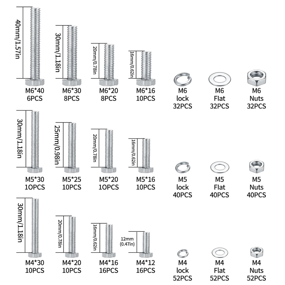 Extensive Package Contents: The kit contains a total of 496 pieces, including a diverse range of sizes: M4 (12 mm, 16 mm, 20 mm, 30 mm), M5 (16 mm, 20 mm, 25 mm, 30 mm), and M6 (16 mm, 20 mm, 30 mm, 40 mm), along with corresponding nuts and washers. This comprehensive assortment ensures that you have the right components on hand to meet your daily needs.