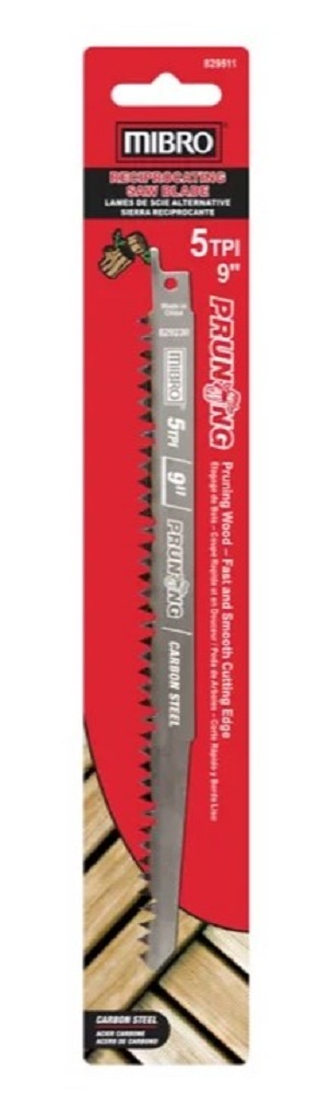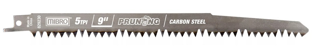 9 in. x 5 TPI High Carbon Steel (HCS) blade for wood pruning Fast, long-lasting performance for cutting living, greenwood Great flexibility for overhead cutting Precision ground blade with extra sharp teeth for fast cutting Mibro saw blade's deep blade gullets between teeth provide fast chip removal 5-degree tilt angle for faster cuts, longer life, and overall improved performance Works with all major reciprocating saw brands, including DeWalt, Porter-Cable, Makita, Ridgid, Milwaukee