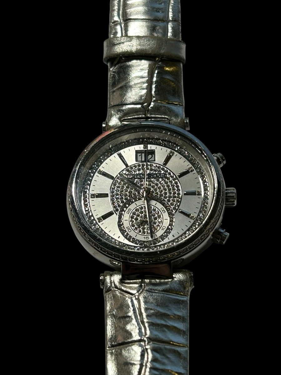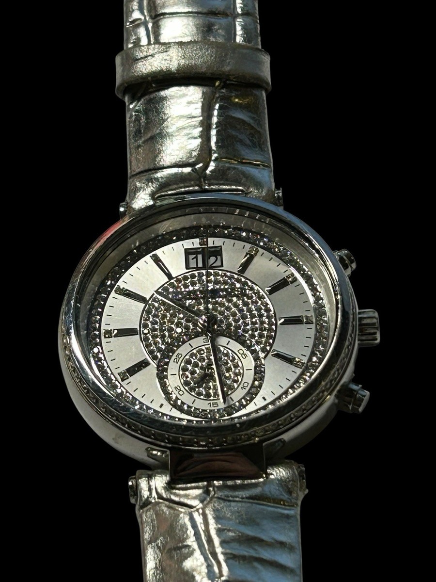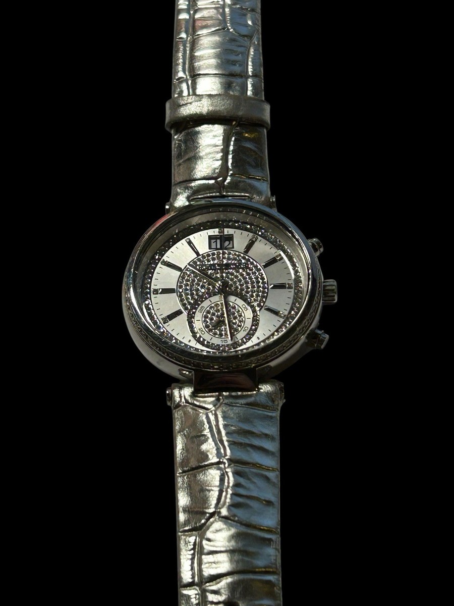 Michael Kors Sawyer MK2443 Silver Bling Dial Watch on Silver Leather Strap