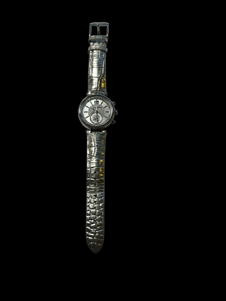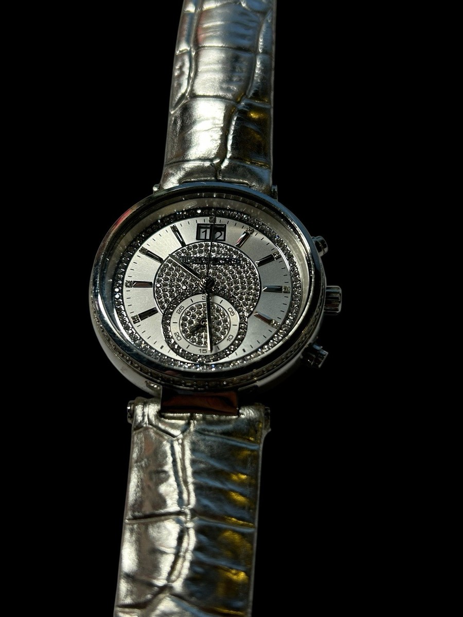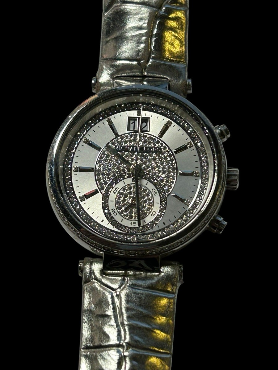- Michael Kors Sawyer MK2443 Silver Bling Dial Watch on Silver Leather Strap