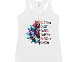 Product description: Unleash your inner strength and style with this vibrant affirmation sunflower women's racerback tank top. This soft, lightweight, and form-fitting tank features a stunning sunflower ? design with eclectic petals in leopard print and vivid hues of blue, purple, pink, and green. The sunflower is accompanied by empowering affirmations: I AM BEAUTIFUL I AM SMART I AM STRONG I AM TALENTED I AM POWERFUL I AM ENOUGH ? This tank top is perfect for any occasion, offering a flattering cut and raw edge seams for an edgy touch. The material is 50% polyester, 25% combed ringspun cotton, and 25% rayon. The fabric is laundered to reduce shrinkage. Raw-edge seams give this tank top an edgy appearance you will love!. T-shirt blank is a Product of Haiti or Nicuragua. Celebrate your beauty, strength, and empowerment with this unique and inspiring tank top! ? This product is made especially for you as soon as you place an order, which is why it takes us a bit longer to deliver it to you. Making products on demand instead of in bulk helps reduce overproduction, so thank you for making thoughtful purchasing decisions!