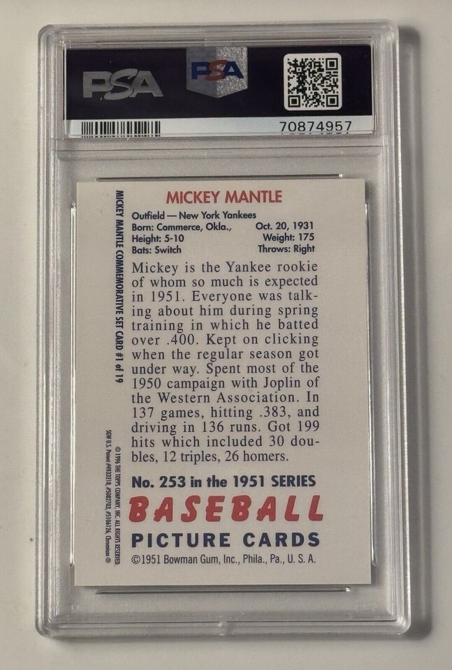 Up for sale is a 1996 Topps FINEST WITH COATING 1951 Refractor REPRINT Card 1 featuring the iconic Mickey Mantle of the New York Yankees. This sports trading card is made of aluminum and card stock, with a card thickness of 35 Pt. It is an original and licensed reprint from Bowman, with a parallel/variety feature. The card is in PSA 8 condition and comes with autograph authentication from Professional Sports Authenticator (PSA). It is a great addition to any baseball fan's collection, especially those who admire Mickey Mantle's legacy. Don't miss the chance to own this piece of baseball history! The card/product you see is the card/product you receive. All cards come with penny sleeve Top Loader Payment must be received within 2 days. There are no returns on graded cards unless you received the incorrect item. Shipping is calculated based on an item's individual weight and packaging. The amount is a flat rate determined per item. Additional purchases may be combined for discounted rates, please await receipt of an invoice when purchasing multiple items. Thank You for considering Joshua's Card Coin Shop!