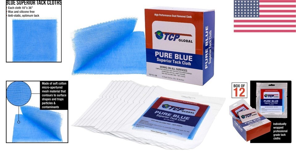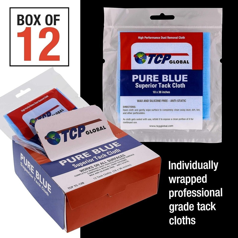 Large, Tear-Resistant Tack Cloths: 12 individually wrapped 18" x 36" Pure Blue tack cloths for optimal dust removal.