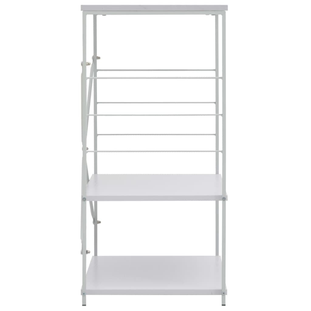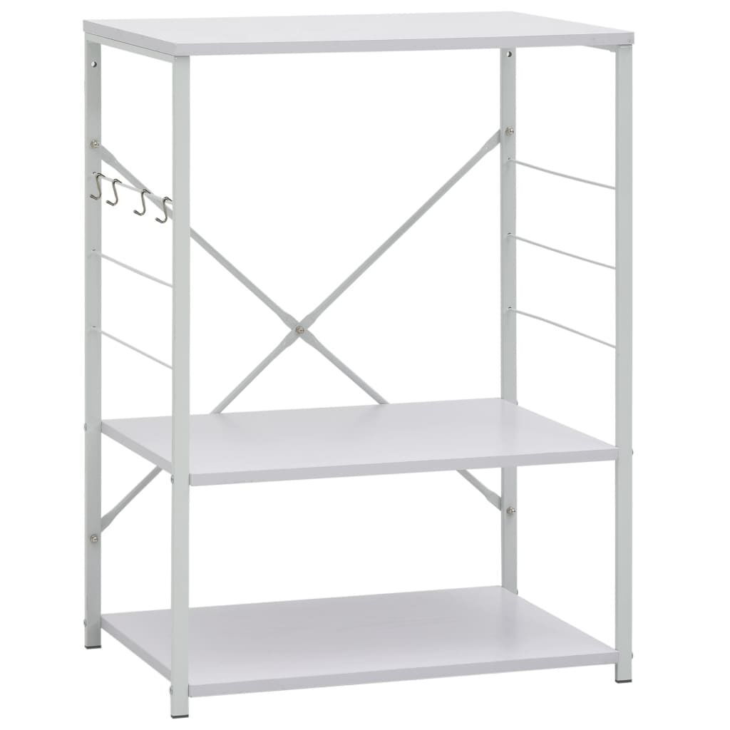 Color: White Material: Engineered wood, powder-coated steel Overall dimensions: 23.6" x 15.6" x 31.3" (L x W x H) Top wood board dimensions: 23.6" x 15.6" x 0.6" (L x W x H) Middle and bottom shelves sizes: 22" x 15.6" (L x W) White post size: 15.2" x 31.3" (W x H) Number of shelves: 3 Side with accessory hooks Max. load capacity (total): 99.2 lb Max. load capacity per shelf: 33.1 lb Assembly required: Yes California Proposition 65