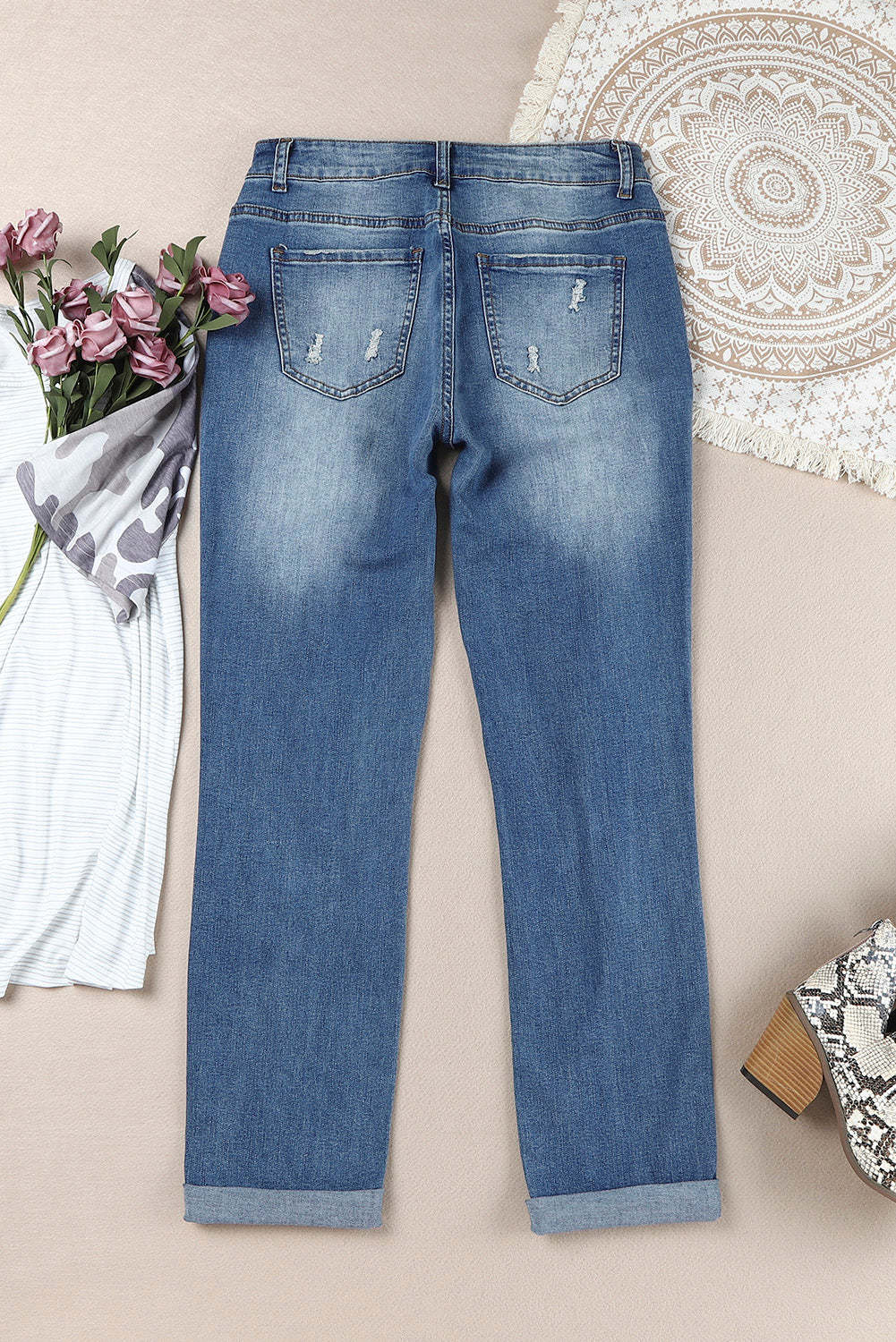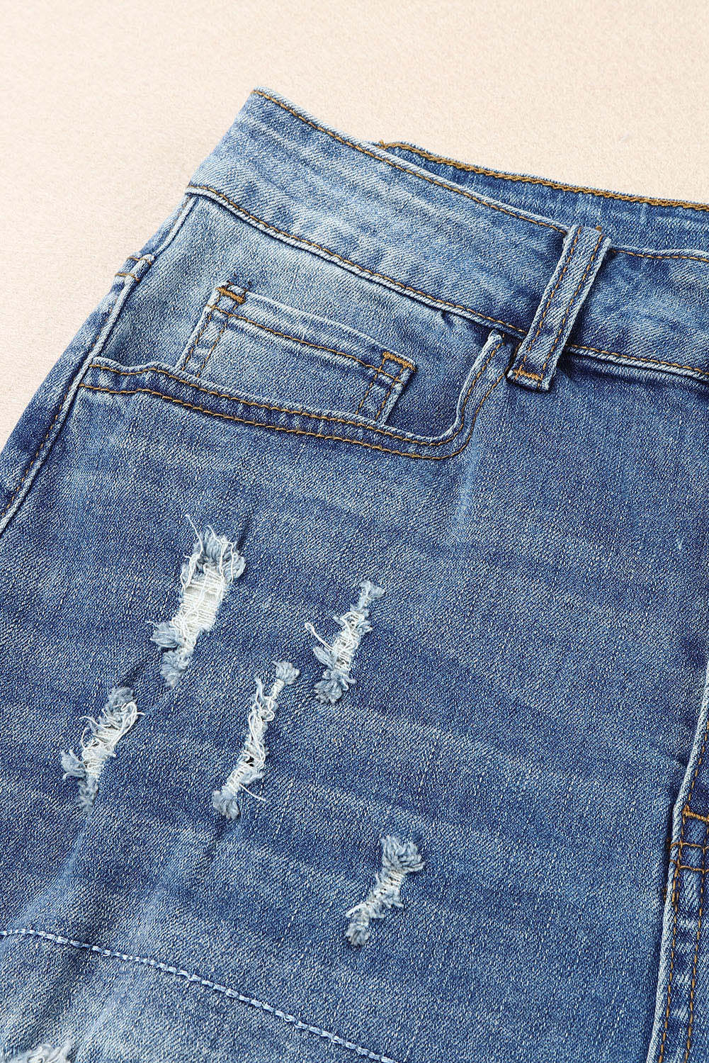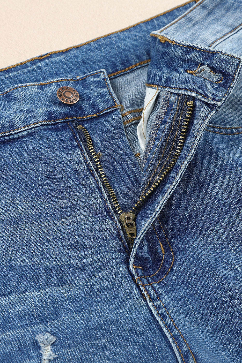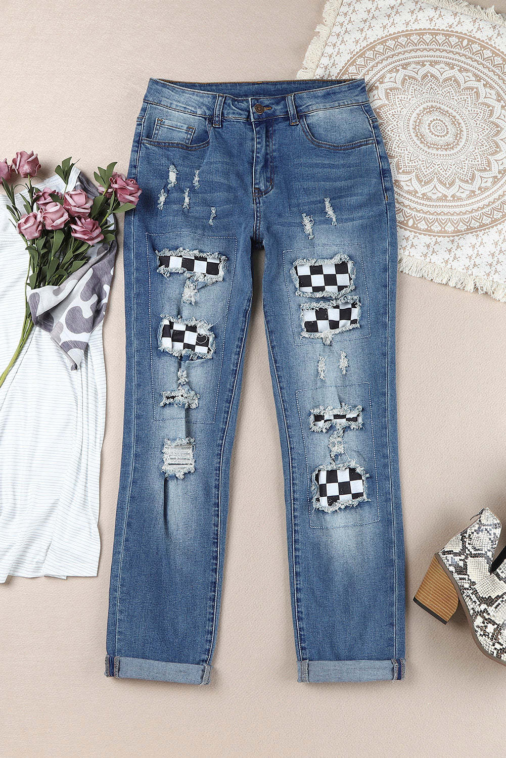 - Mid Waist Checkered Patchwork Distressed Jeans