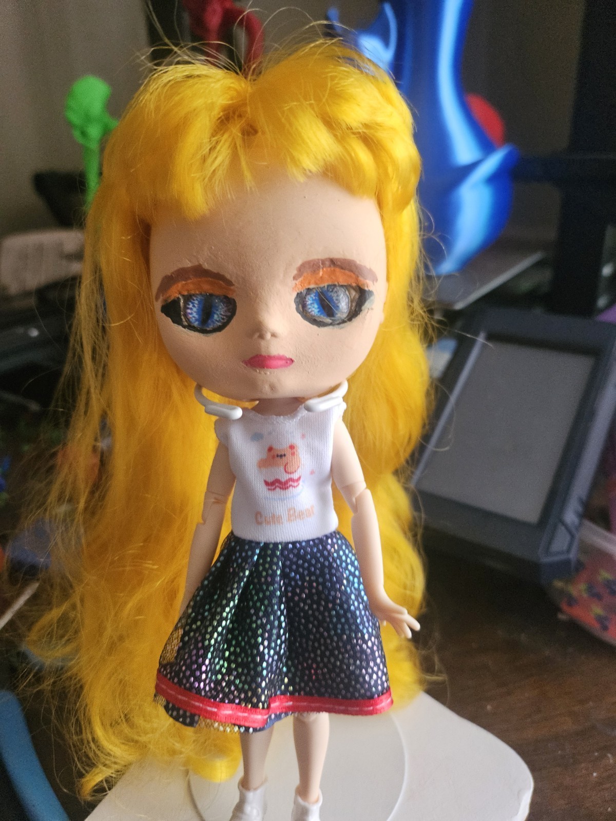 Middie Blythe doll with blue eyes and hand-painted yellow hair with new outfit