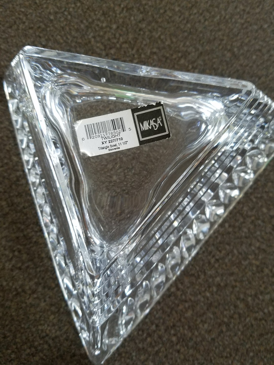 This sale is for one (1) MIKASA Brand Bowl Triangular shaped bowl Measures approximately 11.25" - 11.5" on each side across top Measures approximately 7" tall Twilight Model No. XY 227/710 owl is very heavy in weight There is one (1) small bubble in the bottom of the bowl (see photos) No chips ~ cracks or repairs Please view photos for a good description of this bowl Thank you!