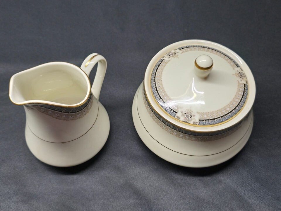 - MIKASA GRANDE IVORY Creamer & Sugar Bowl + Lid TROPEZ Shades Of Gray Floral Band